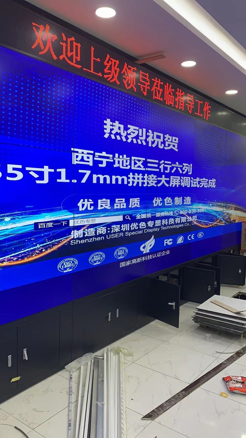青海西寧黃河鑫業運維控製室液(yè)晶(jīng)拚接屏,采用驗收專顯55寸1.8mm落地機櫃頂部安裝LED條形屏方案,項目已安裝(zhuāng)且驗收竣工。
