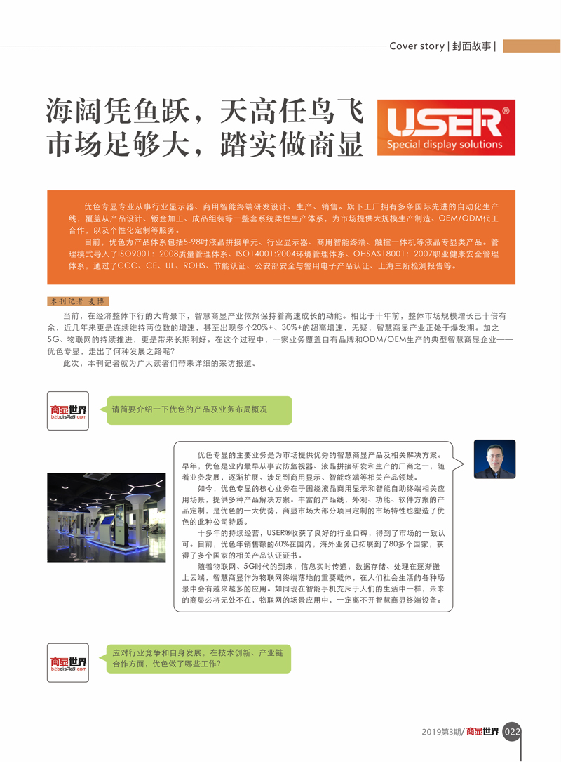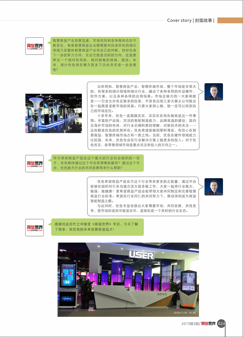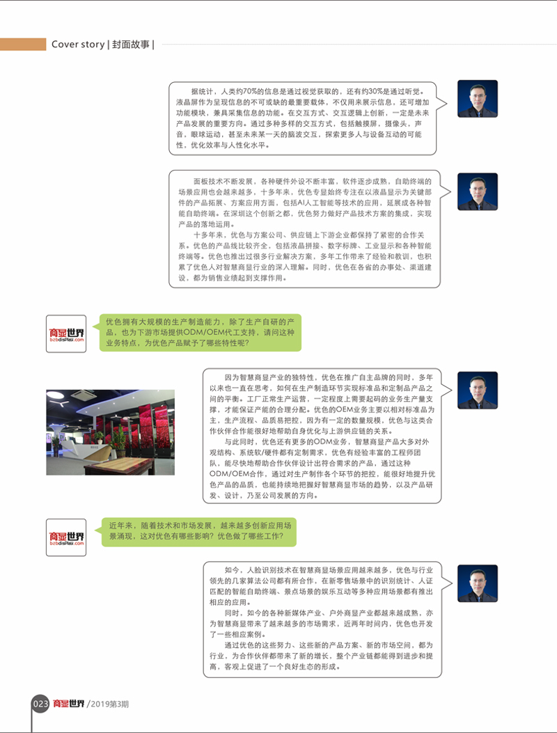 近日91视频网站專顯接(jiē)受商顯世界專訪,在此次采(cǎi)訪中優(yōu)色總經理劉峰認真分析未來智慧商顯行業(yè)發展趨勢,講(jiǎng)述91视频网站專顯自身的產(chǎn)品及業務布(bù)局概況,隨著高速5G和萬(wàn)物互聯時代的到來,信息(xī)實時傳遞(dì),數據存儲、智能雲端,智慧商(shāng)顯(xiǎn)作為物聯網終端的重要載體,在人類生活的各種場景中會得到廣泛應用。 91视频网站專顯本次專訪刊登在商顯世界2019年第03期,以下是專訪的詳細內容與大家(jiā)一起分享: