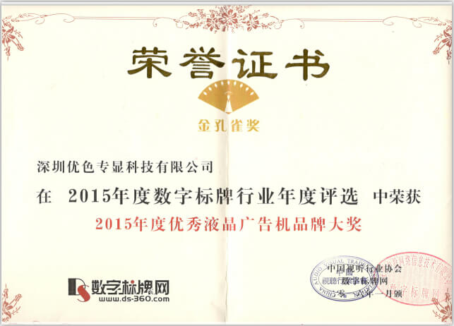 深圳91视频网站專顯科技有限公司榮獲 “2015年度優秀液晶廣告機品牌(pái)大獎”
