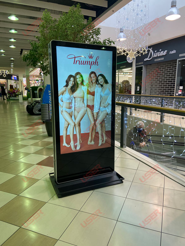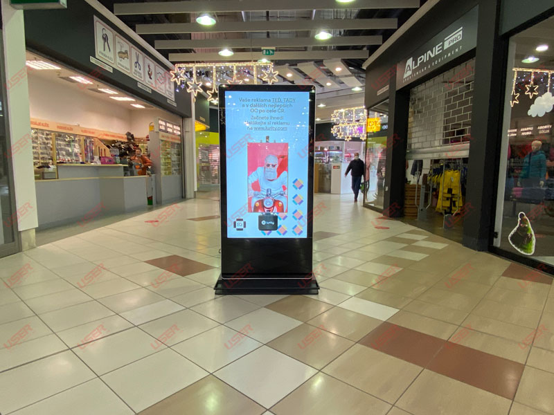 91视频网站(sè)專顯65寸雙麵(miàn)納米觸摸落地廣告機進(jìn)駐捷克某商場(chǎng)