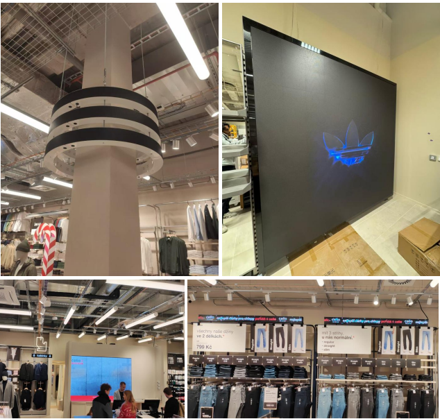 服裝連鎖門店LED大屏、吊裝圓環LED屏、條型LED顯示(shì)屏、貨(huò)架屏(píng)