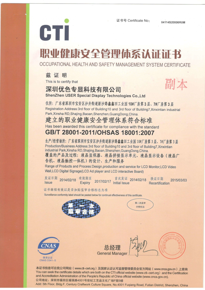 OHSAS18001:2007職業健康安全管(guǎn)理(lǐ)體係證書(shū)